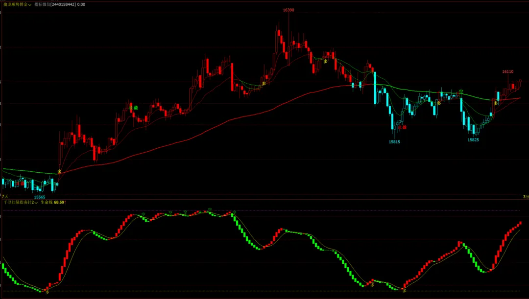 千寻红绿指南针幅图:红绿多空柱,多空顶底信号,趋势线