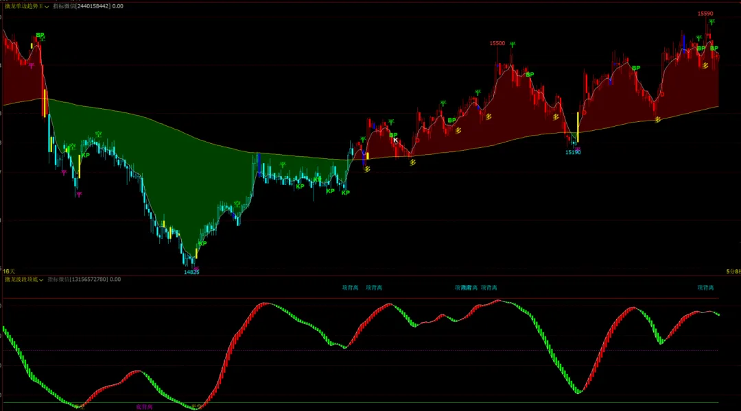 擒龙波段顶底幅图:红绿涨跌柱,顶底背离信号