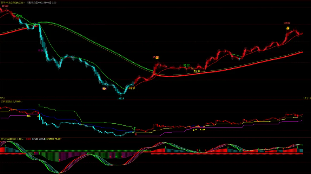 擒龙趋势1号主图:趋势变色线,短线变色线,多空K变色