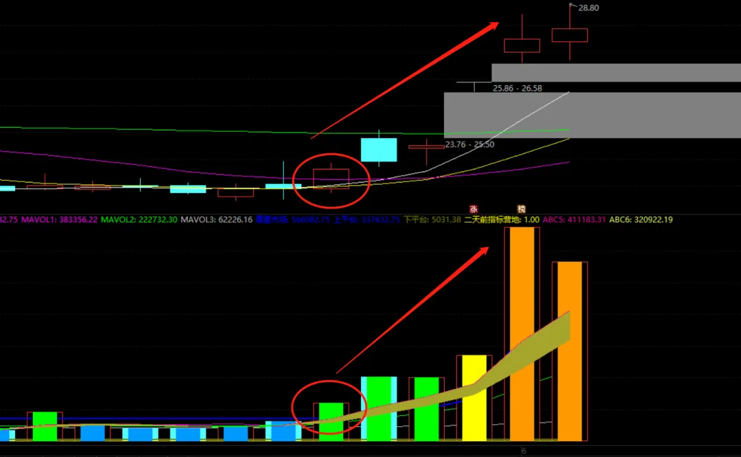 条件 :量柱颜色从长期的绿色/蓝色,突然转变为黄色或橙色(换手率3%-10%)。 同时,当天的量柱实体,突破了蓝色的**“上平台”**线。 副图中的两条细线(EMA均线)呈现红带(多头排列)。 操作 :这意味着沉寂已久的股票开始有主力资金进场点火,且突破了前期的量能压制。此时是最佳的波段买入点 ,坐等拉升。