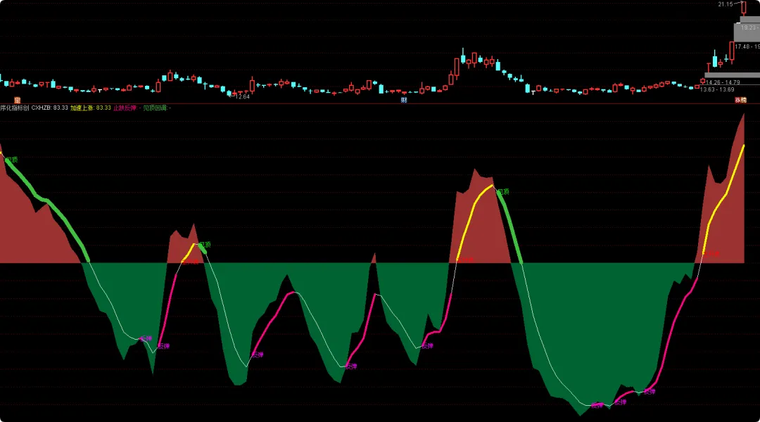 粉色止跌反弹:当CXHZB<50且ZBXS>CXHZB时,提示底部反弹机会