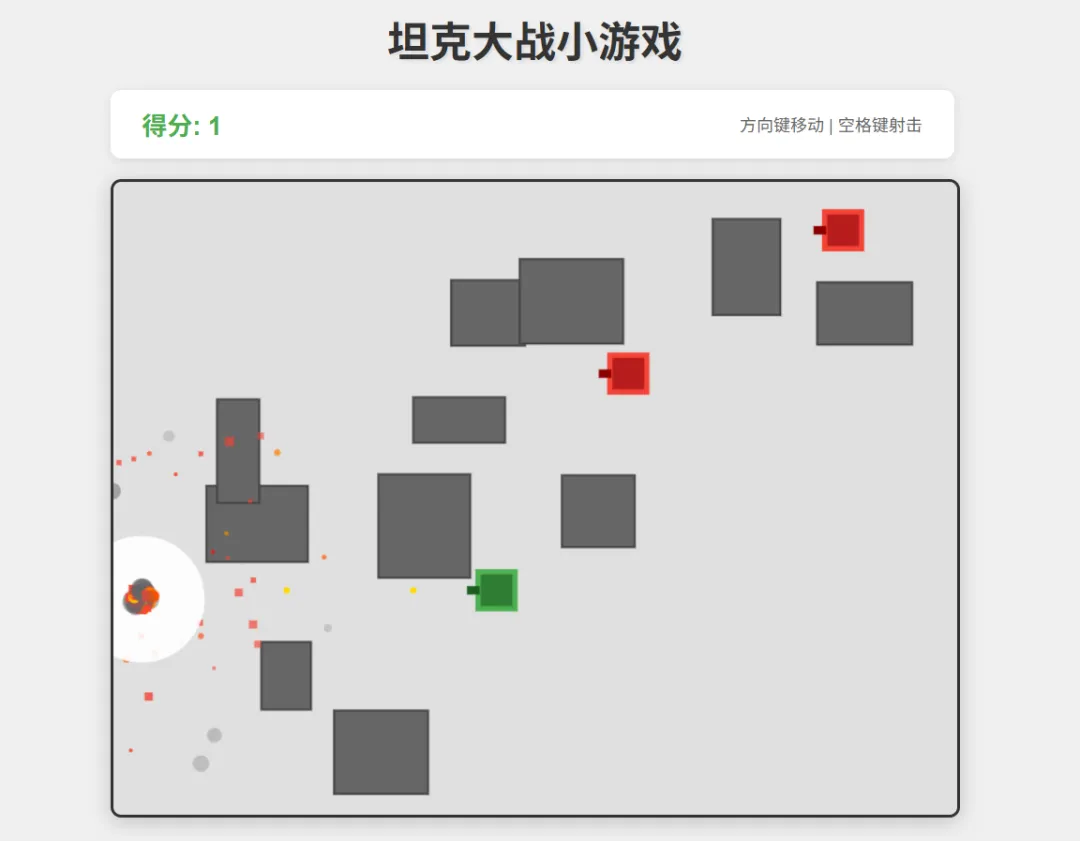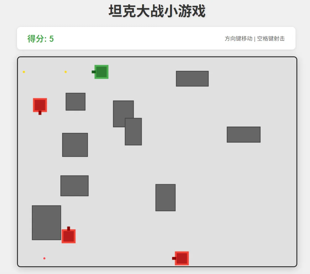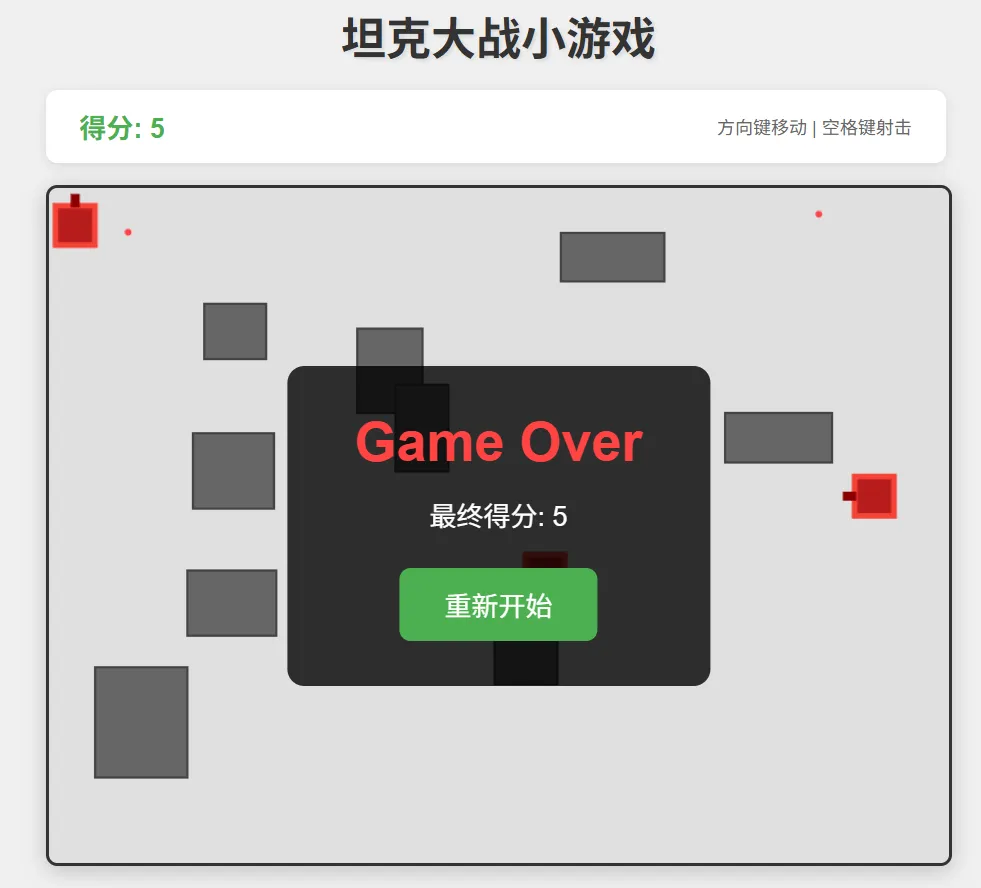 <!DOCTYPE html><htmllang="zh-CN"><head><metacharset="UTF-8"><metaname="viewport"content="width=device-width, initial-scale=1.0"><title>坦克大战小游戏</title><linkrel="stylesheet"href="tank_game.css"></head><body><divclass="game-container"><h1>坦克大战小游戏</h1><divclass="game-info"><divclass="score">得分: <spanid="score">0</span></div><divclass="controls">方向键移动 | 空格键射击</div></div><divclass="canvas-container"><canvasid="gameCanvas"width="800"height="600"></canvas><divclass="game-over"id="gameOver"><h2>Game Over</h2><p>最终得分: <spanid="finalScore">0</span></p><buttonclass="restart-btn"onclick="restartGame()">重新开始</button></div></div></div><scriptsrc="tank_game.js"></script></body></html>