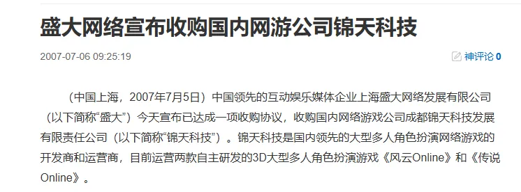 在2007年,盛大直接用超过1亿的资金,全资收购了锦天科技。