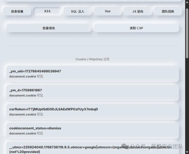 解析 Set-Cookie:从响应头中解析 Set-Cookie,区分 HttpOnly / 非 HttpOnly,辅助判断 Cookie 窃取/前端可见性