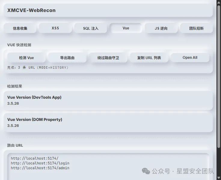 用于快速判断站点是否使用 Vue,并尽可能拿到更具体的版本线索与路由 URL 清单,以及辅助绕过前端路由守卫