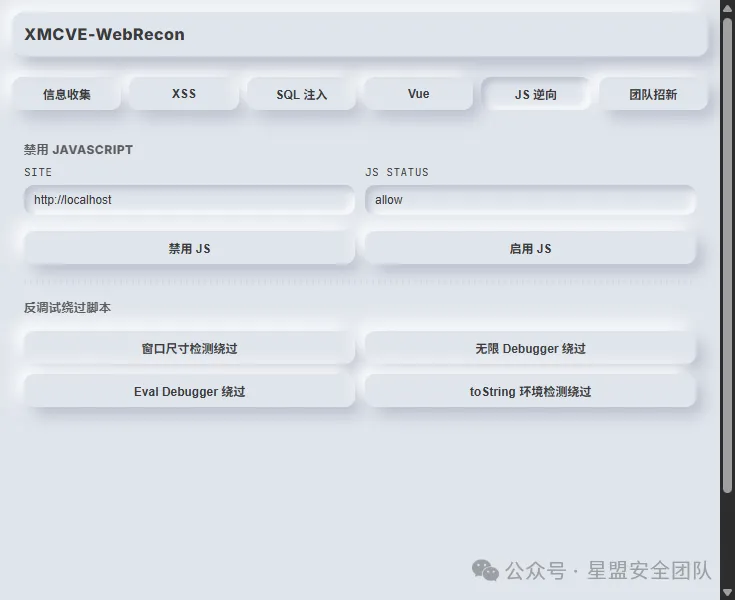 用于按站点开关 JavaScript,并注入多种 Anti-Debug 绕过脚本(便于观察 SSR 结果、降低前端干扰、辅助逆向分析与调试)