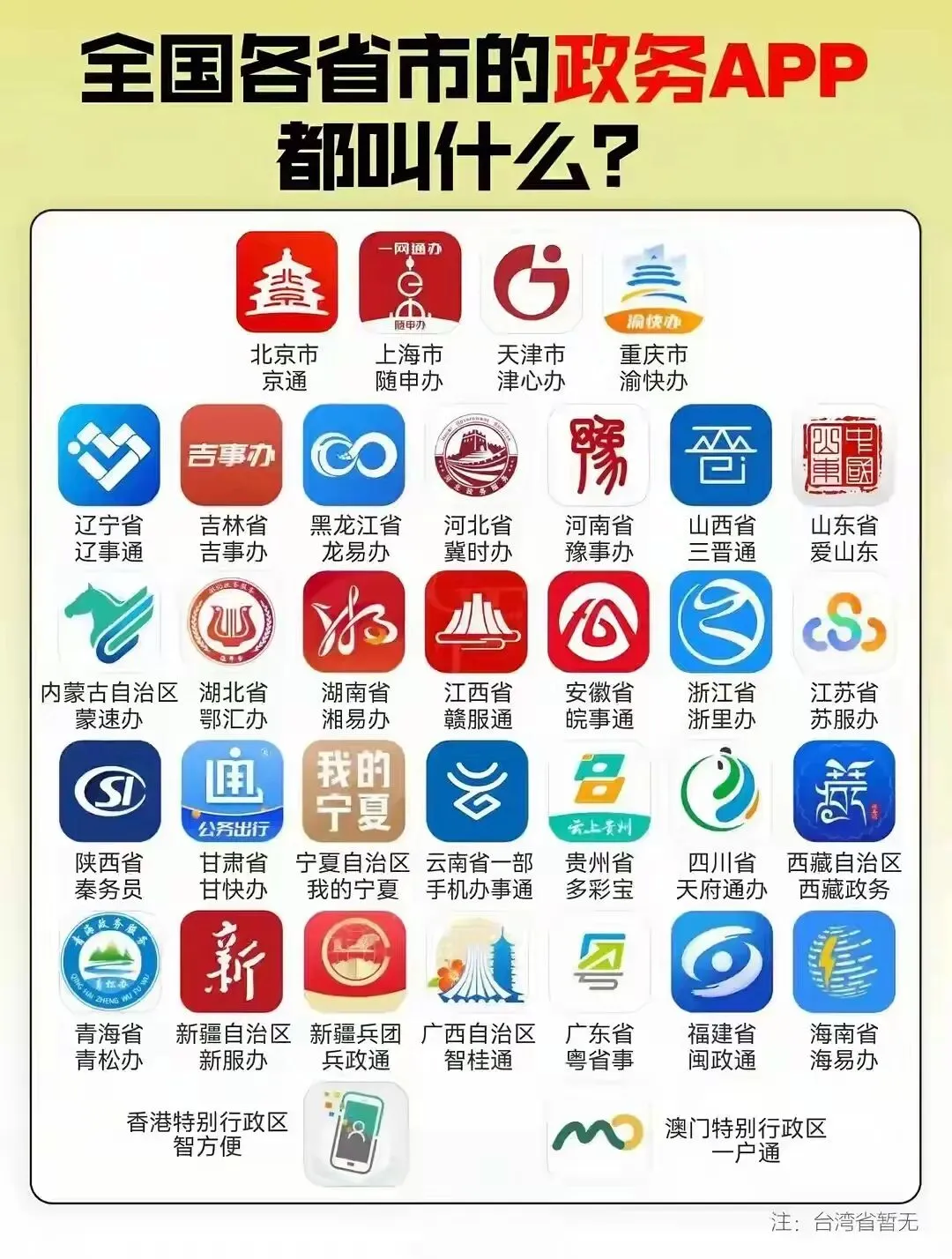 刷到一个全国各省市政务APP的汇总图,发现还挺有意思的,大家的名字都很有地方特色。