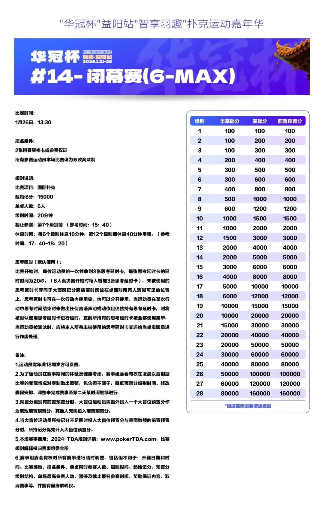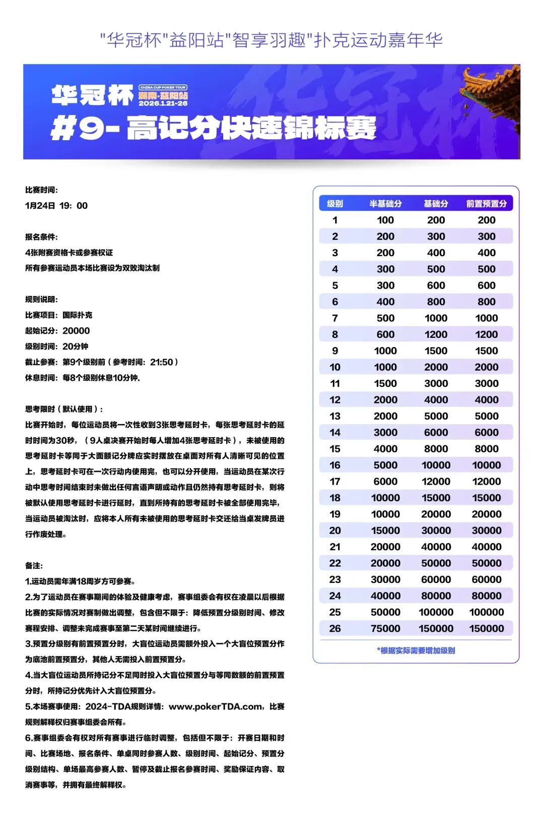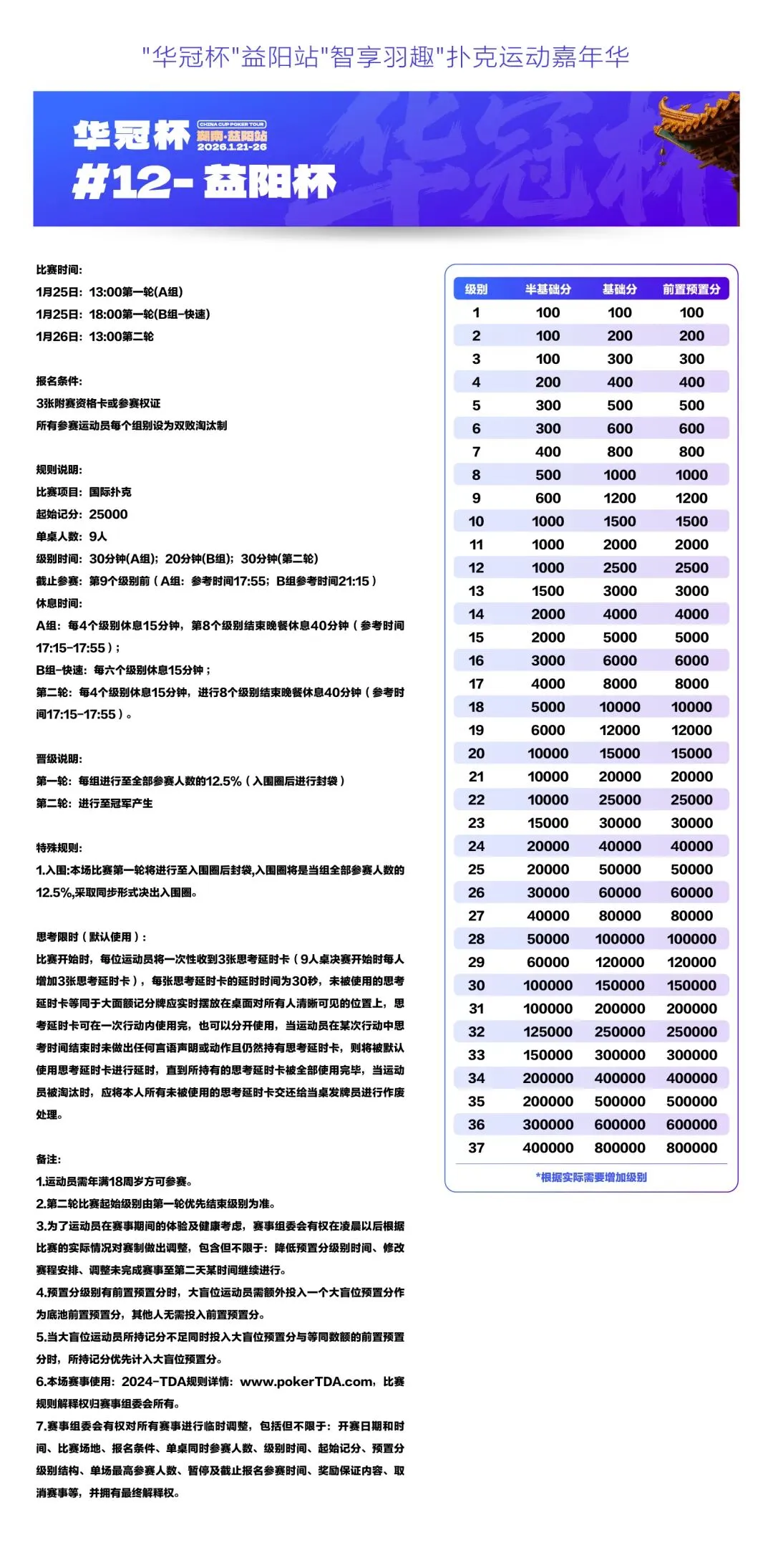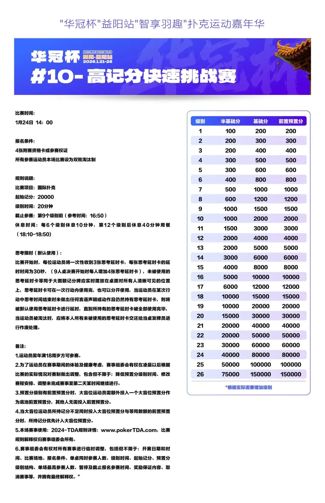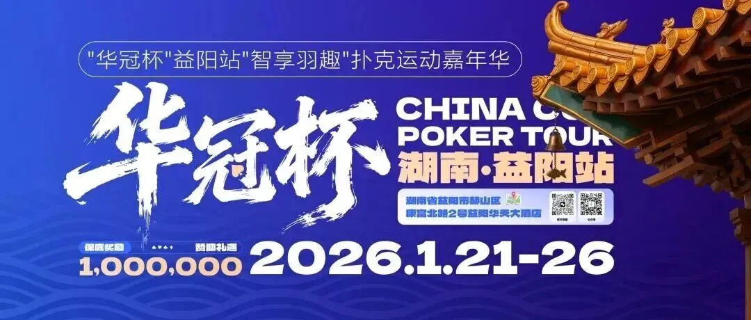 2026湖南华冠杯益阳站“智享羽趣”国际扑克大赛,已定档2026年1月21日-26日,经益阳市赫山区文化旅游广电体育局正式批准,于益阳华天大酒店举办。