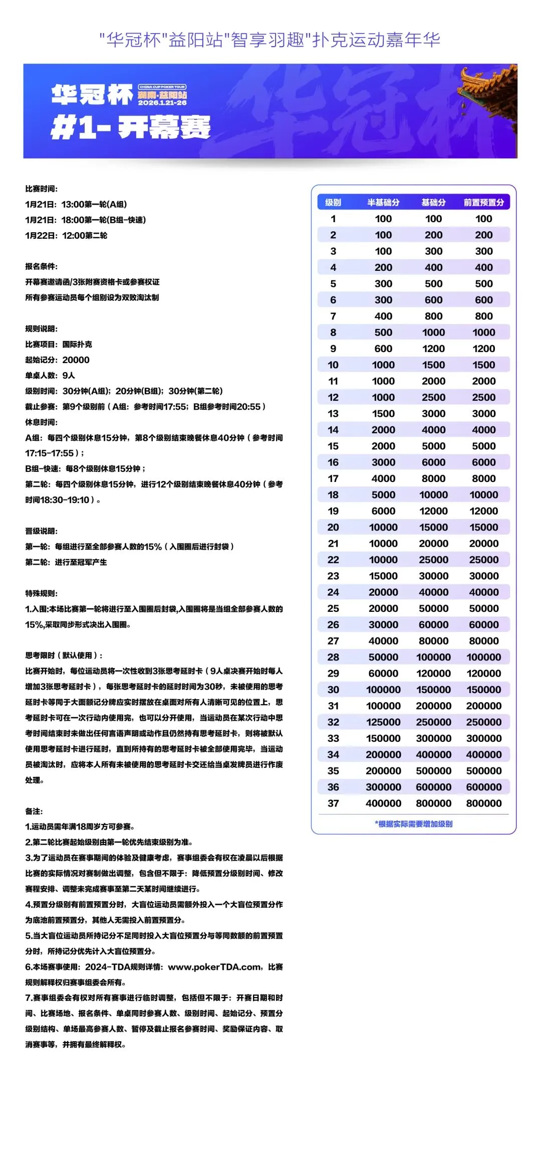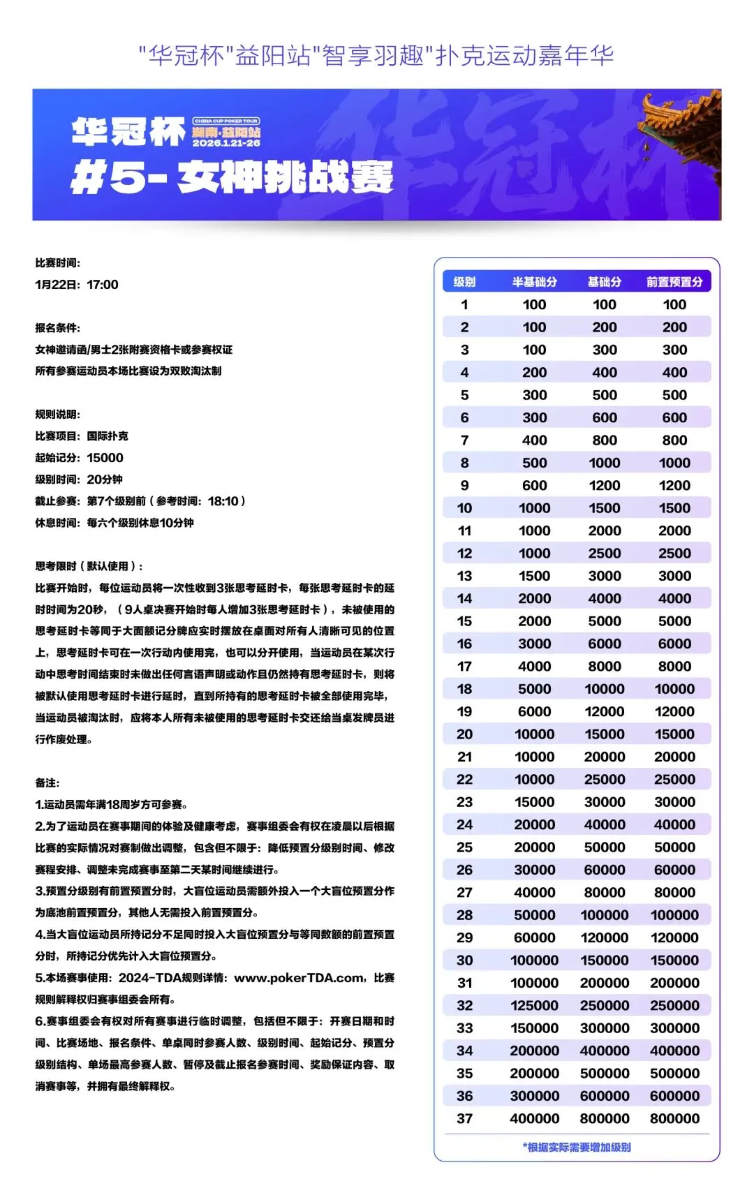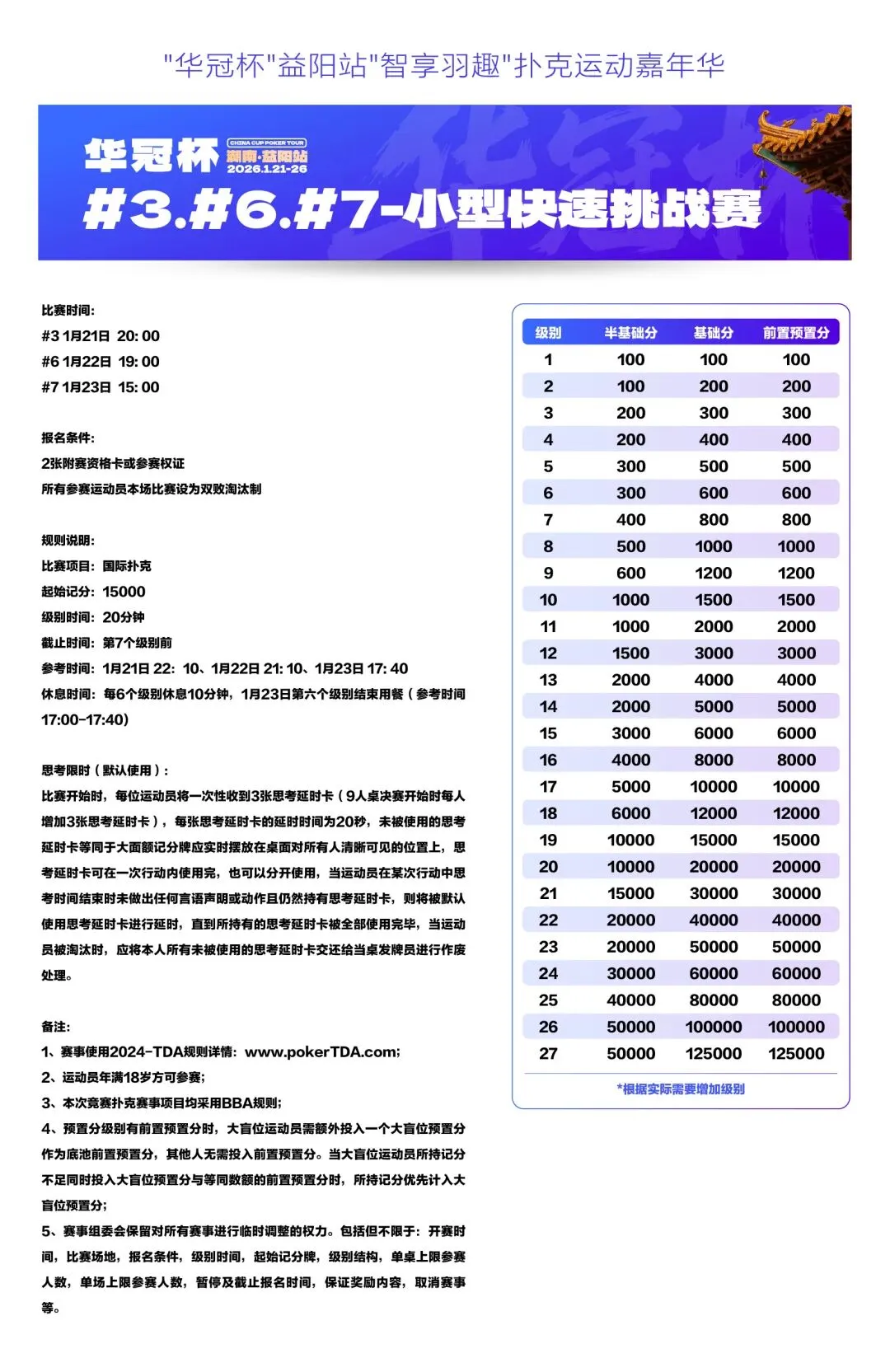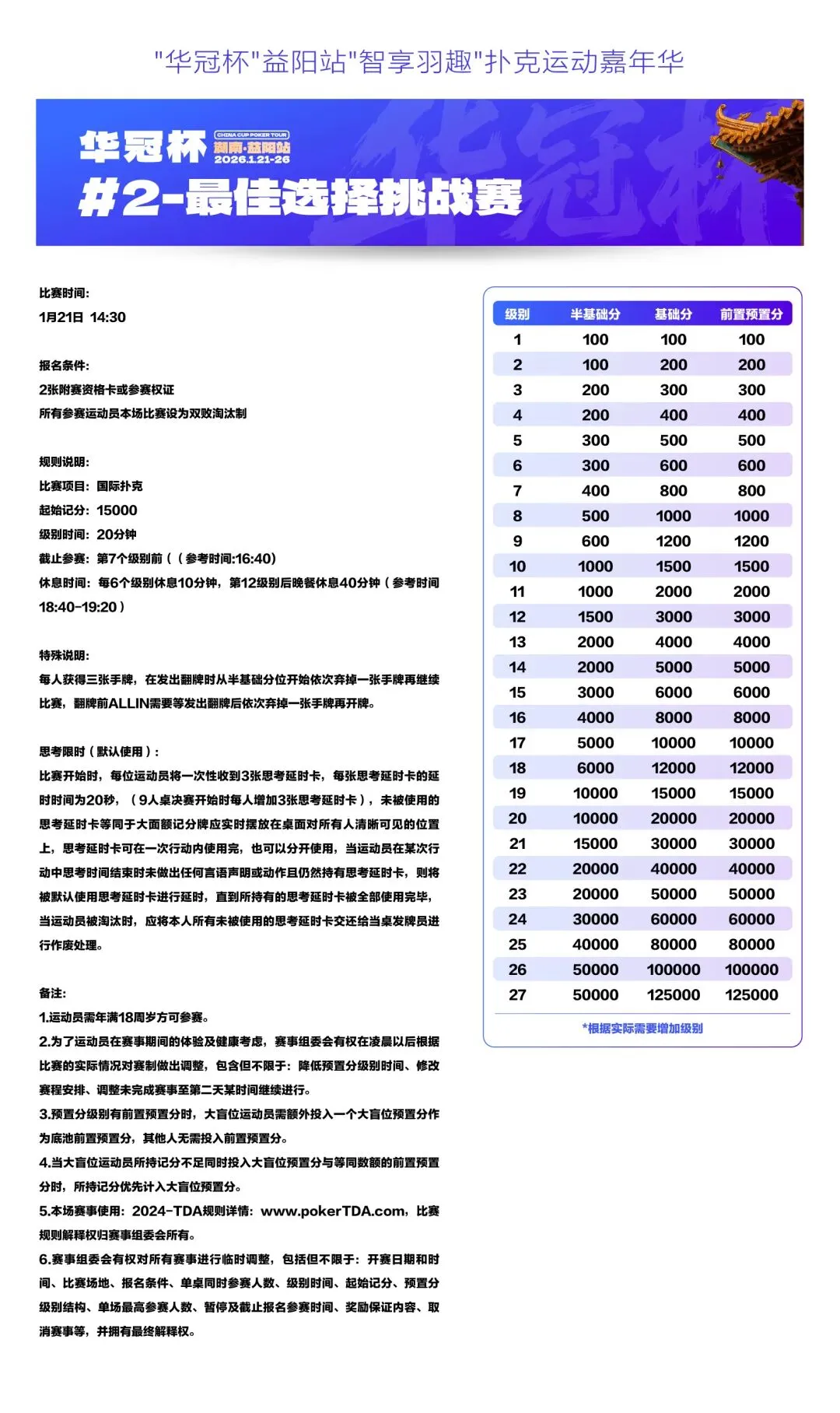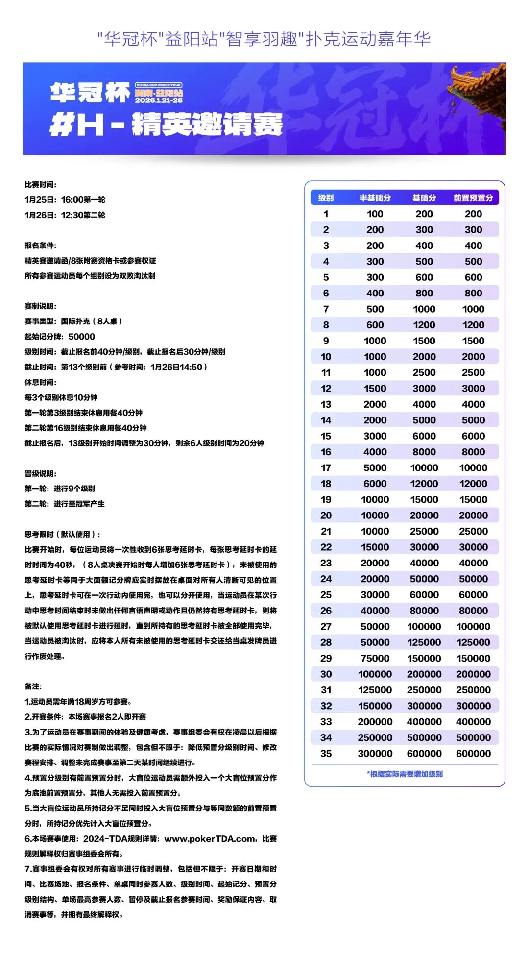 2026湖南华冠杯益阳站“智享羽趣”国际扑克大赛,已定档2026年1月21日-26日,经益阳市赫山区文化旅游广电体育局正式批准,于益阳华天大酒店举办。