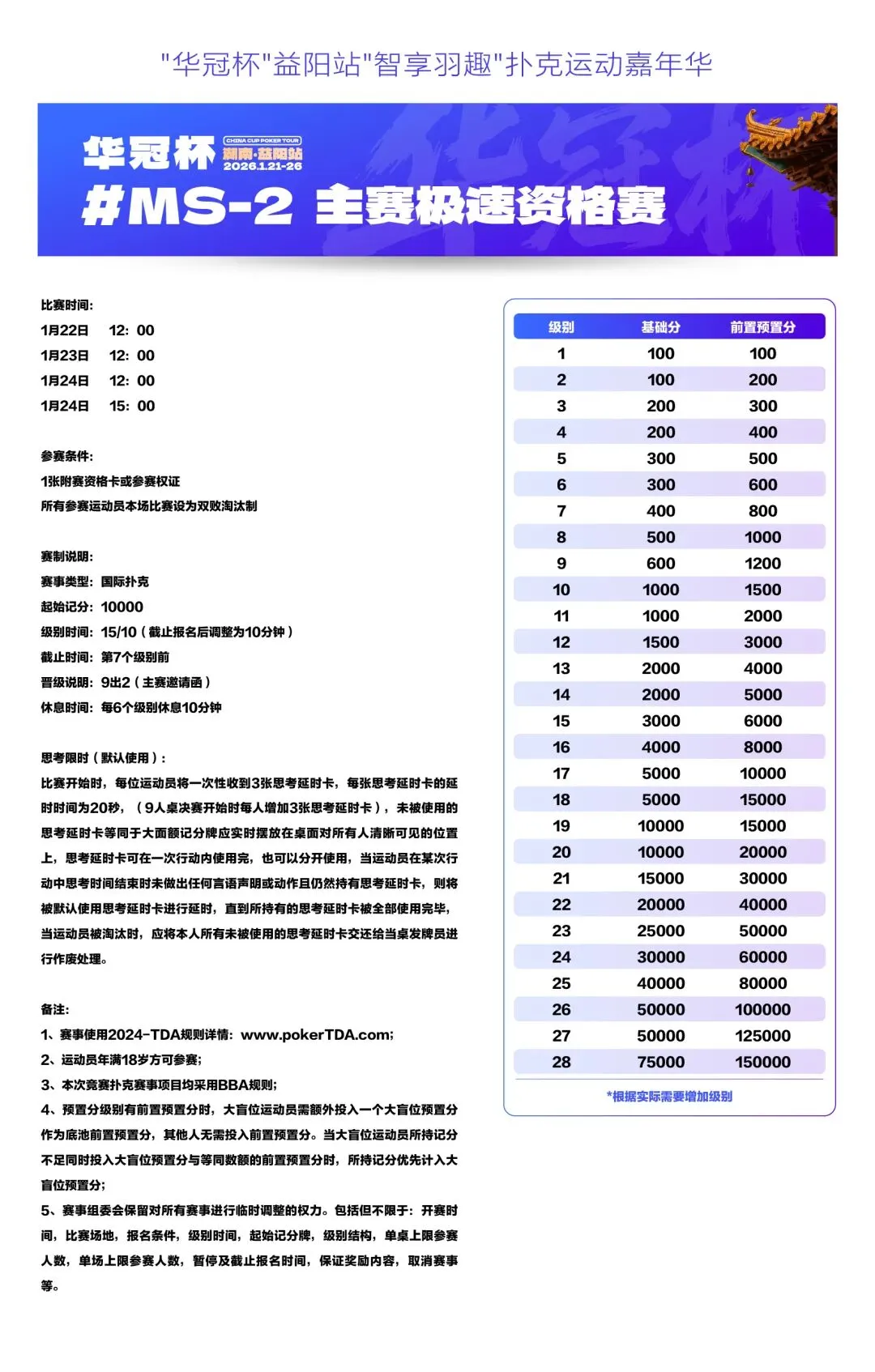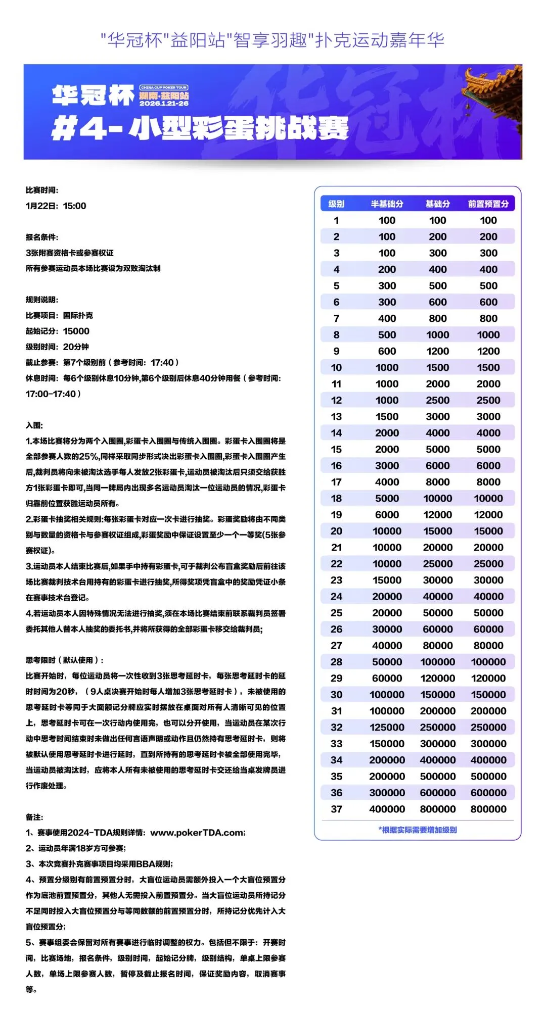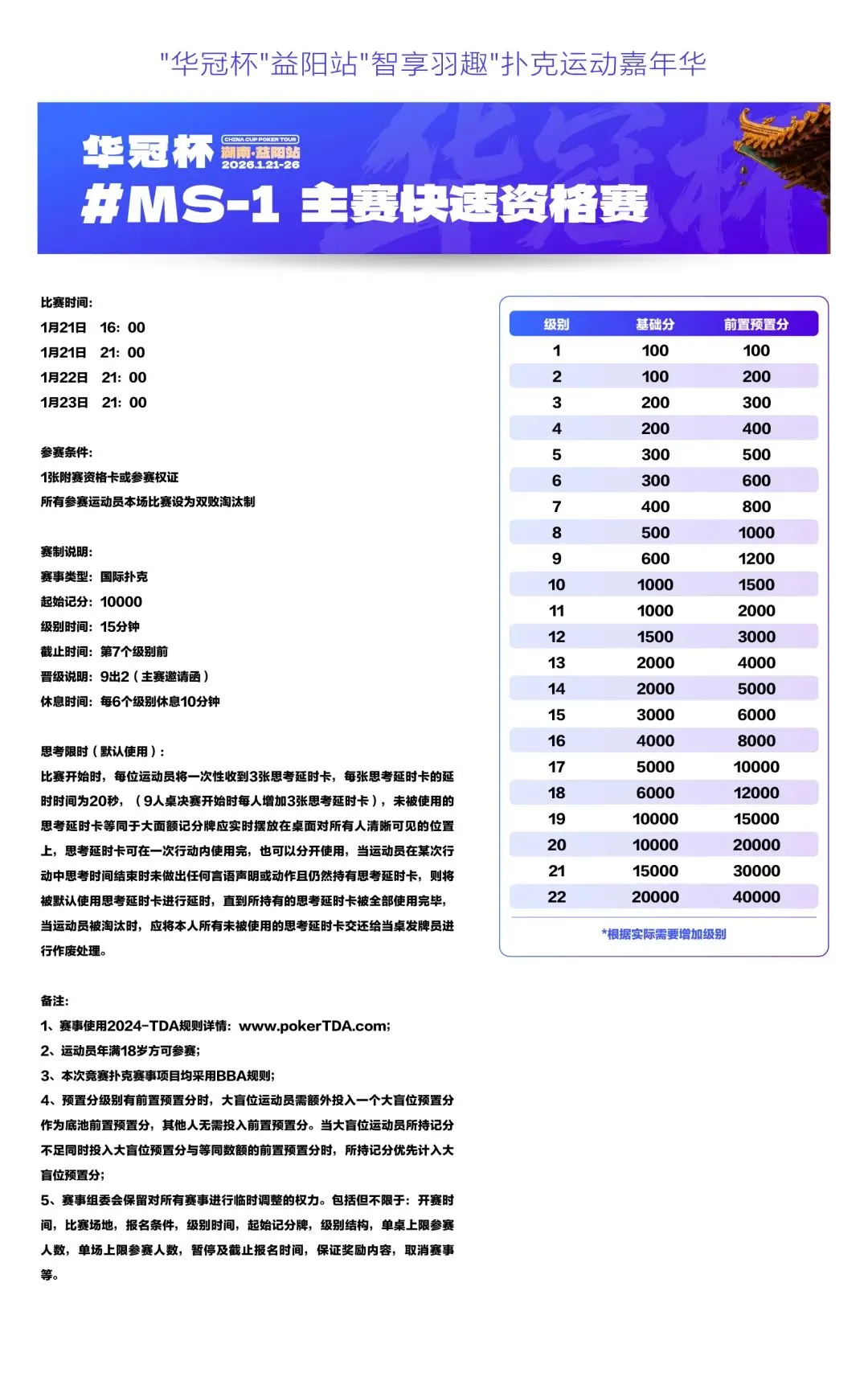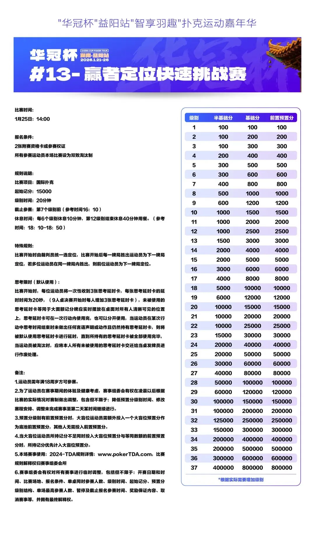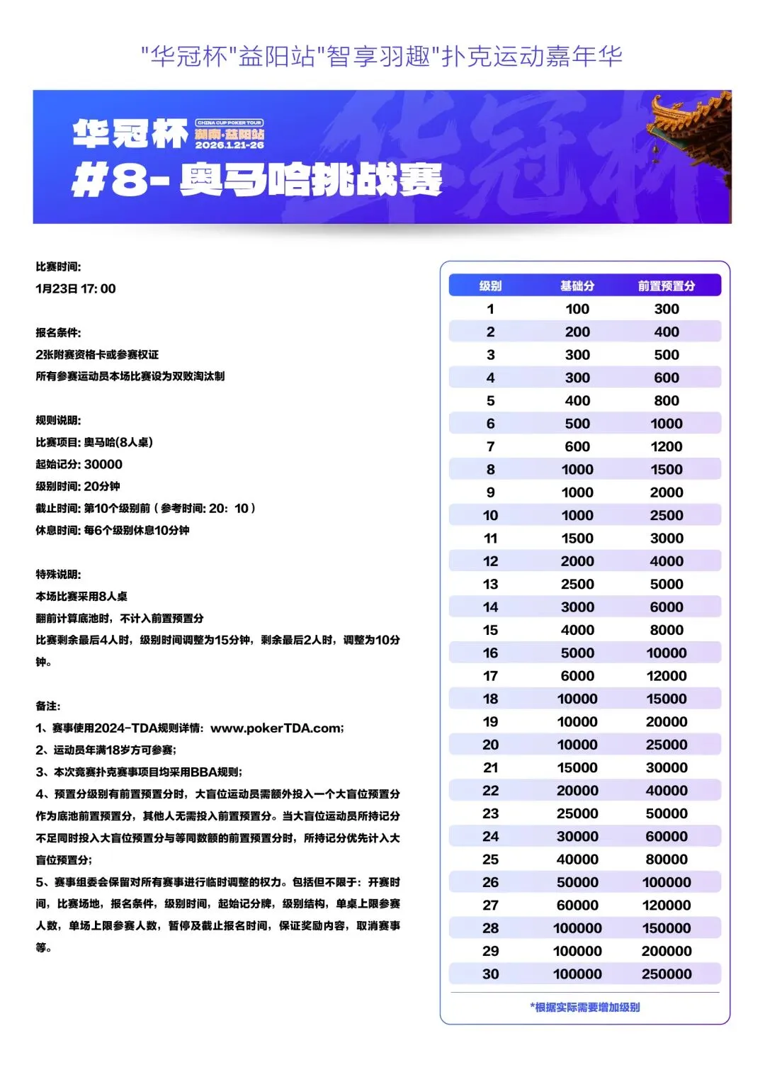 2026湖南华冠杯益阳站“智享羽趣”国际扑克大赛,已定档2026年1月21日-26日,经益阳市赫山区文化旅游广电体育局正式批准,于益阳华天大酒店举办。