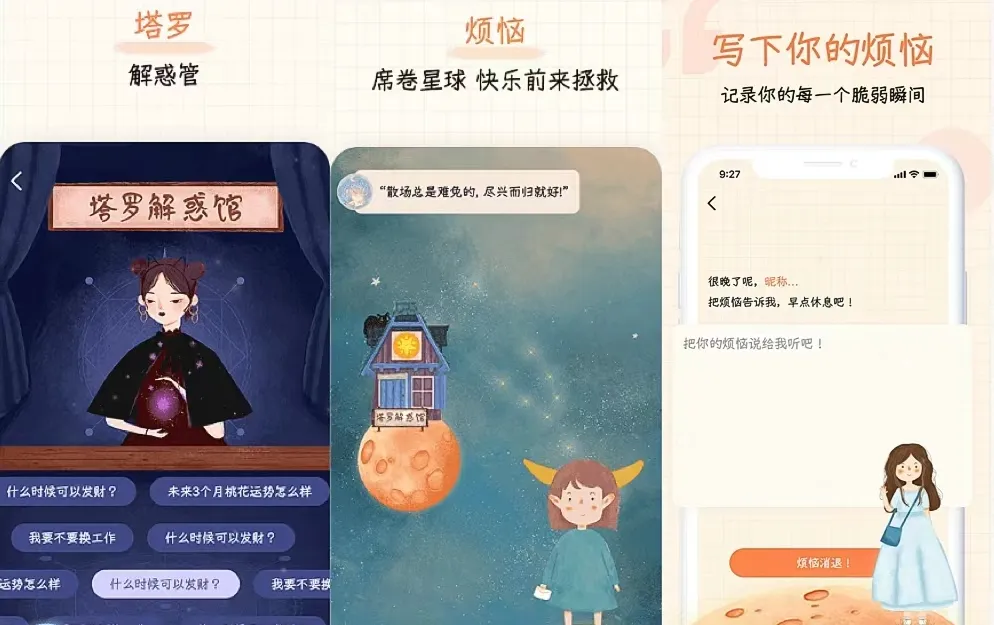 会引导你写出忧虑和烦恼,用塔罗牌帮你排忧解难,还可以写信给陌生人,能收到回信哦。