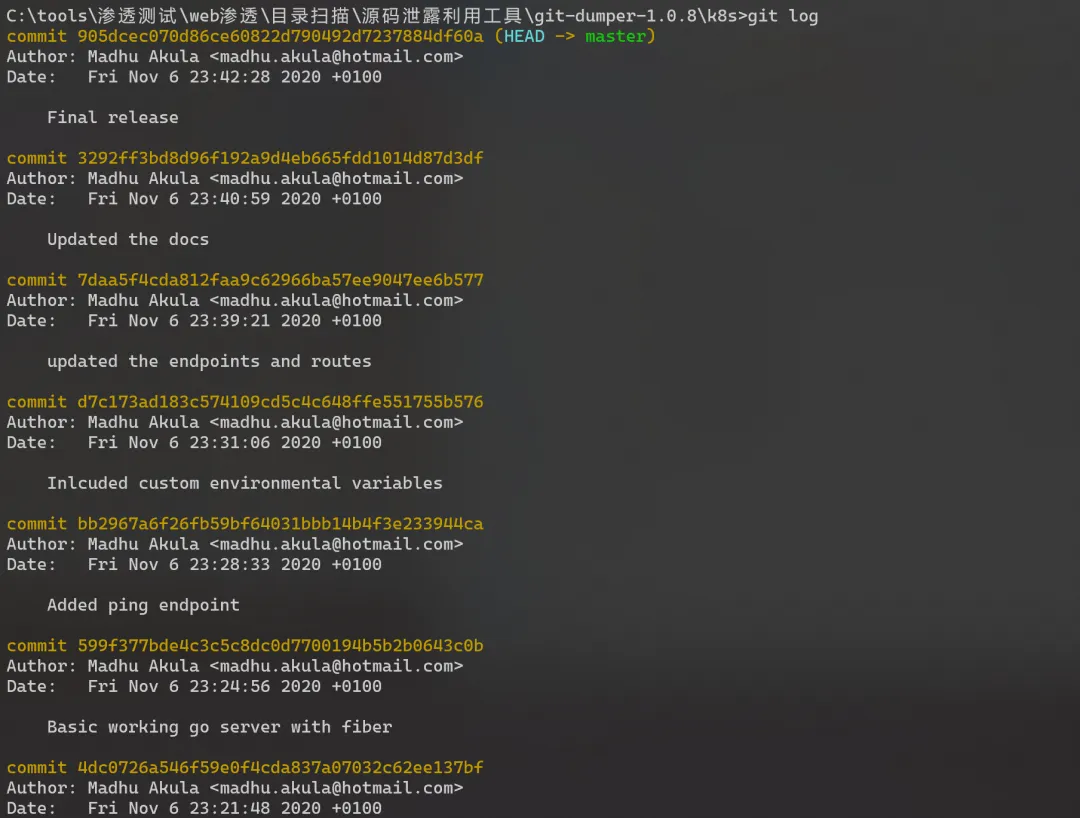 比如当我们下载了.git 目录后,进入该目录执行 git log。如下内容是该 Git 仓库的提交历史记录,包括了每次提交的:提交哈希(commit ID)、提交作者、提交时间、提交说明
