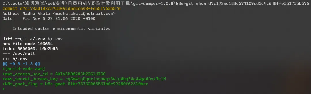 其中有一条提交的变更记录的说明是“Inlcuded custom environmental variables”。我们重点看一下这条记录。发现这条记录新增了一个 .env 文件,其中包含了 AWS 密钥和靶场 flag。