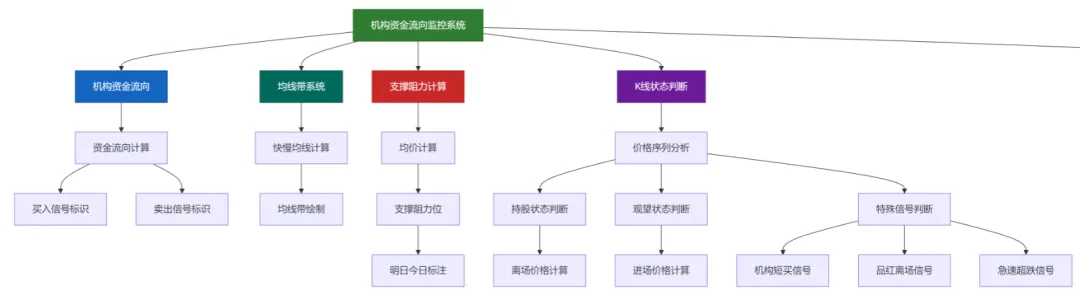 机构资大金流向模块通过成交量价格关系计算主动买卖量,识别大额资金流入流出,在净流入超过300万且涨幅≥4%时标注”机构买入”,净流出超过300万且跌幅≥3%时标注”机构卖出”。均线带系统通过10日和20日EMA加权组合形成快线,结合成交量调整的DMA形成慢线,用色带展示多空趋势。支撑阻力计算模块通过四价平均法计算明日和今日的支撑阻力位,为交易提供参考。K线状态判断模块通过复杂的价格序列分析,识别”红色持股”和”青色观望”状态,并计算相应的进场离场价格,同时识别”机构短买”、”品红离场”、”急速超跌”等特殊信号。形成直观的多状态K线显示系统。