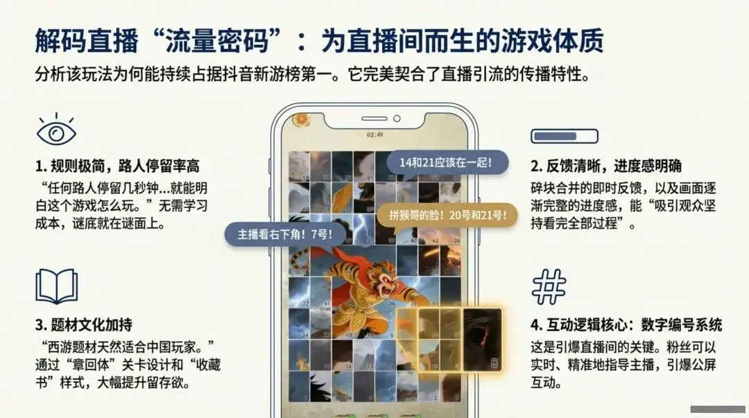 2. 直播间神技: 在直播场景下,这种拼图游戏观点看两秒就知道怎么玩的。而且“局部拼接”的过程非常直观,配合数字角标,主播会问xxx在那儿帮我看一下。观众会忍不住发弹幕指挥主播:“把左下角 18 号红色块移过去!”能帮上主播的忙,这有的人比自己玩还激动。