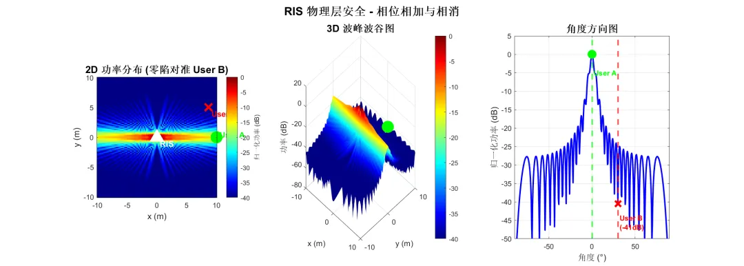 效果: 3D 图中可以清晰看到合法用户位于”波峰”,而窃听者被精确置于深蓝色的”波谷” (零陷坑) 中。