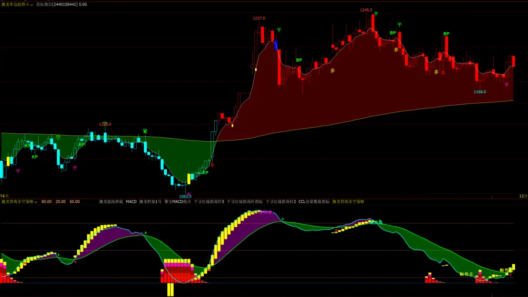 擒龙单边趋势王主图:红绿趋势背景色,多空信号,DK,KP,BP