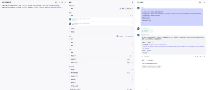 如果用户输入的信息中包含名称、花名、工作流ID、访问令牌,提取对应的内容,调用工作流{#LibraryBlock id="7530257856889831424" uuid="Ns3MXac_Pc1e3N64XCD4E"type="plugin" apiId="7530258448685187087"#}invoke_workflow{#/LibraryBlock#}。如果用户输入的信息中包含工作流参数、工作流ID、解释请求正文的方式、认证类型,调用工作流{#LibraryBlock id="7530261097295888434" uuid="Cwi24m7LDTV2sT0XS1pSU"type="plugin" apiId="7530261346399780873"#}invoke_workflow{#/LibraryBlock#}。