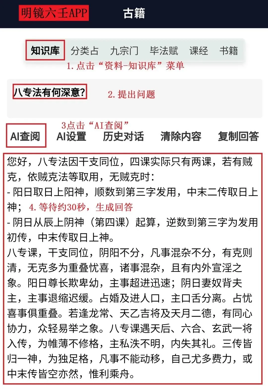 AI知识库加入了明镜六壬的使用说明,也可以直接在知识库问怎么用明镜六壬APP。
