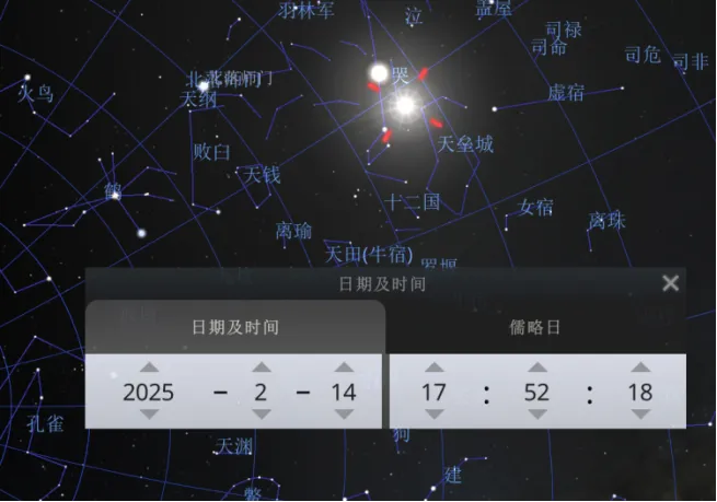 2025.2.14,17:52,月亮在天盘翼宿,与Stellarium中真实星象一致。