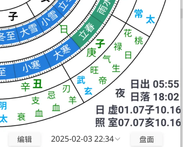 比如,2025年 2 月 3 日 22 点立春,根据“太阳行度歌”口诀——“立春虚一起”,则太阴在虚宿1度。其他政余星体也应根据太阳增减的位置度数,增减相应的位置度数。