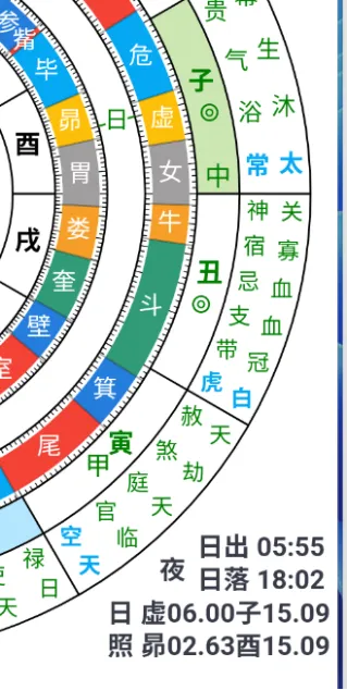 2.点击编辑和盘面中间的日期时间∨,可以对年月日时以及分钟(点击小时旁边的小圆圈)进行快速加减,实现四柱“搜局”功能,也可以实现“观星”功能。选择星宿六壬盘,设置郑案今宿,勾选天盘时分转动,贵人设置日出没时间。2025.2.14,17:52,太阳在天盘虚5度,星宿盘与Stellarium中真实星象一致。太阳照射地盘酉宫,日落时间为18:02,太阳未落,贵人为昼贵人。