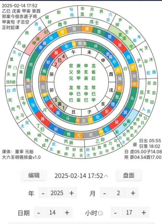 2.点击编辑和盘面中间的日期时间,可以对年月日时以及分钟(点击小时旁边的小圆圈)进行快速加减,实现四柱搜局功能,也可以实现观星功能。选择星宿六壬盘,设置郑案今宿,勾选天盘时分转动,贵人设置日出没时间。2025.2.14,17:52,太阳在天盘虚5度,星宿盘与Stellarium中真实星象一致。太阳照射地盘酉宫,日落时间为18:02,太阳未落,贵人为昼贵人。