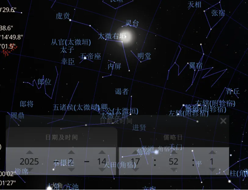 2025.2.14,17:52,月亮在天盘翼宿,与Stellarium中真实星象一致。