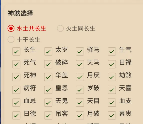9.神煞选择,勾选相应神煞后,盘面选择选中神煞后,则显示勾选后的神煞。