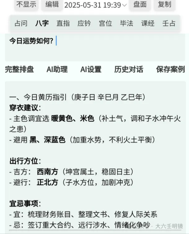 明镜APP依托六壬盘面数据库,转码成DeepSeek能识别的正确课盘,时间、月将、四课三传均准确无误。并且根据我个人的占断经验,设定了一些框架和准则,经过大量调试,对大模型进行了一些特殊的训练和调教。断课思路支持占断八门、占断六步、精调等断课模式,同时接入了DeepSeek R1V3和豆包大模型,多种语言风格可选。