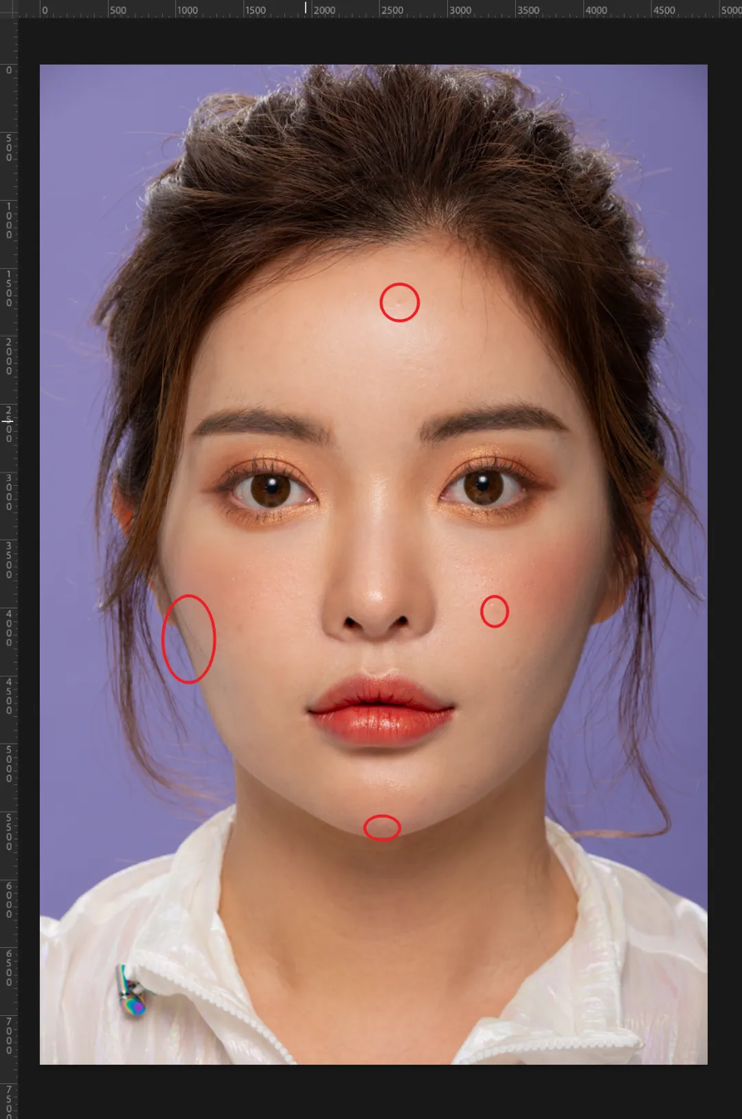 选择高频层,使用污点修复画笔工具,把面部细小的瑕疵处理掉。