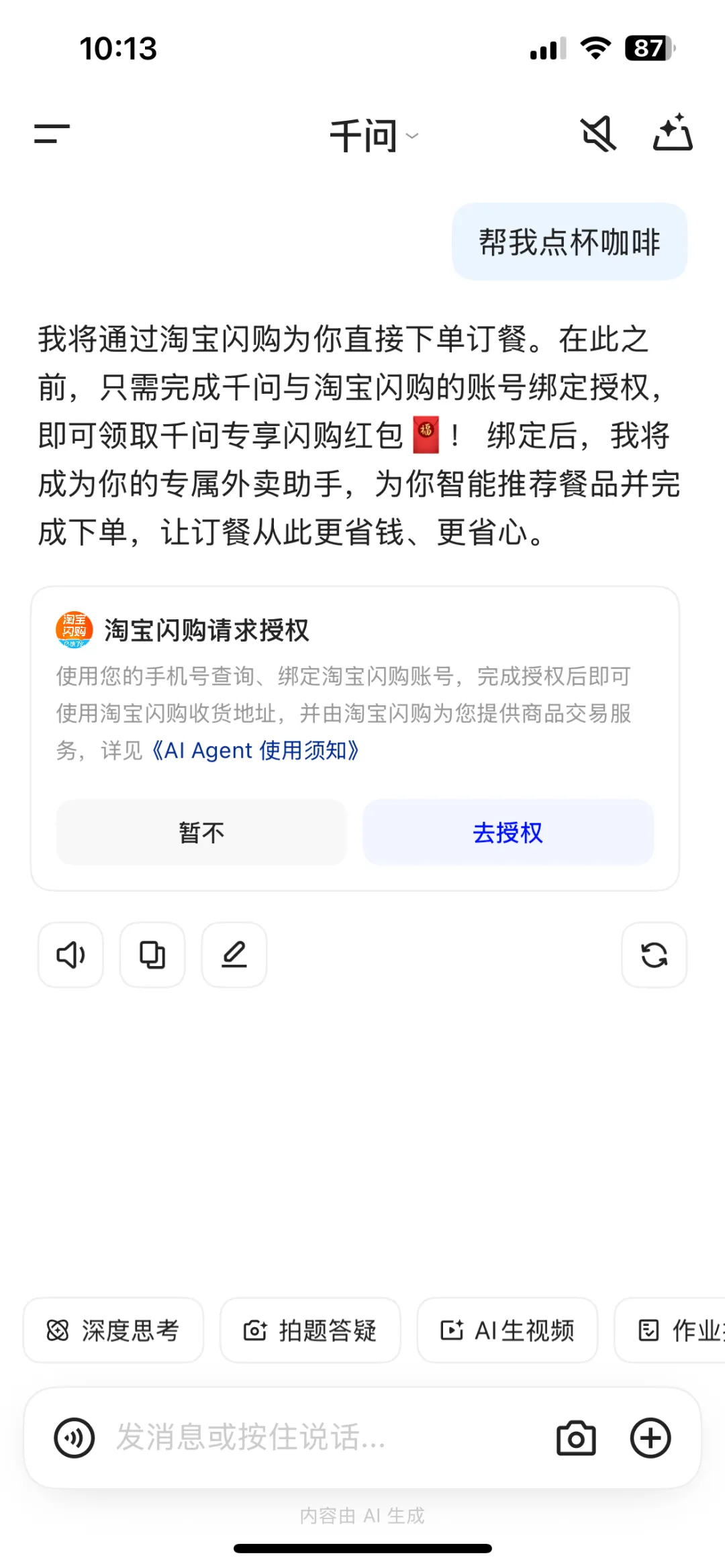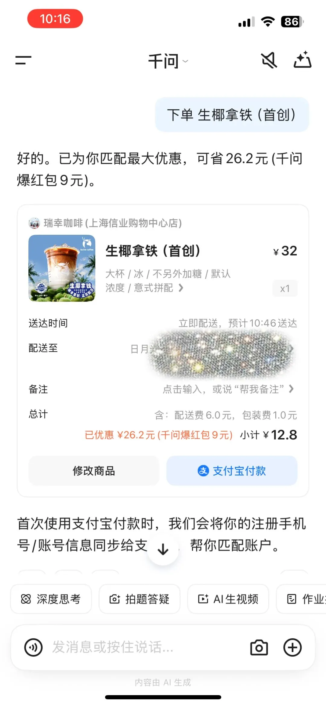 回到文章开头提到的 OPC(一人公司)。国家政策解决了你“准生证”和“场地”的问题。而阿里千问这类 AI Agent,解决了你“团队”的问题。对于创业者来说,这意味着什么?行政总监: AI 帮你订票、安排行程。采购经理: AI 帮你全网比价、下单进货。财务助理: AI 帮你记录账单、分析收支。你作为“超级个体”,只需要做大脑,负责决策和创意。繁琐的、重复的、跑腿的活儿,全部交给 AI 这个“虚拟团队”。它 24 小时待命,不要工资,而且执行力极强(比如那杯提前14分钟送达的咖啡)。