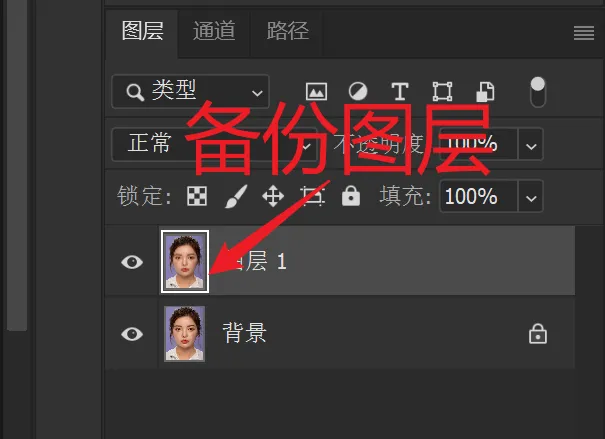 首先复制背景图层,选择复制的备份图层,用污点修复画笔工具,处理面部明显的瑕疵。