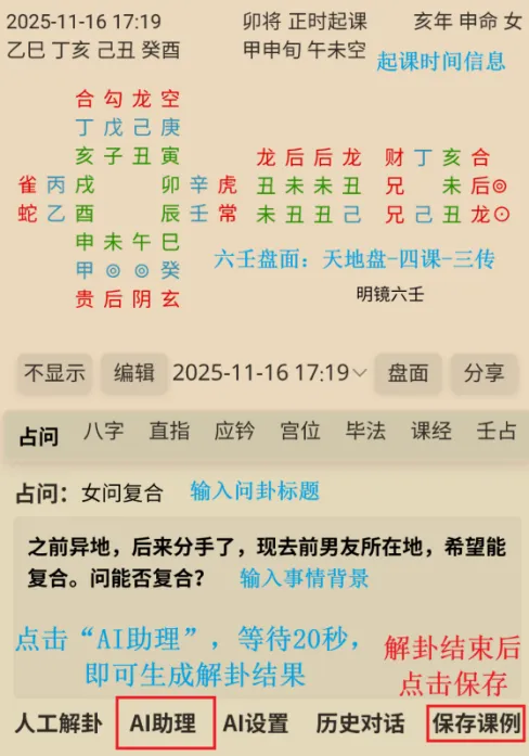耳机丢了?感情不顺?工作纠结?选六壬模式,输入问题,不到20秒后AI就会根据卦象给你指条明路!