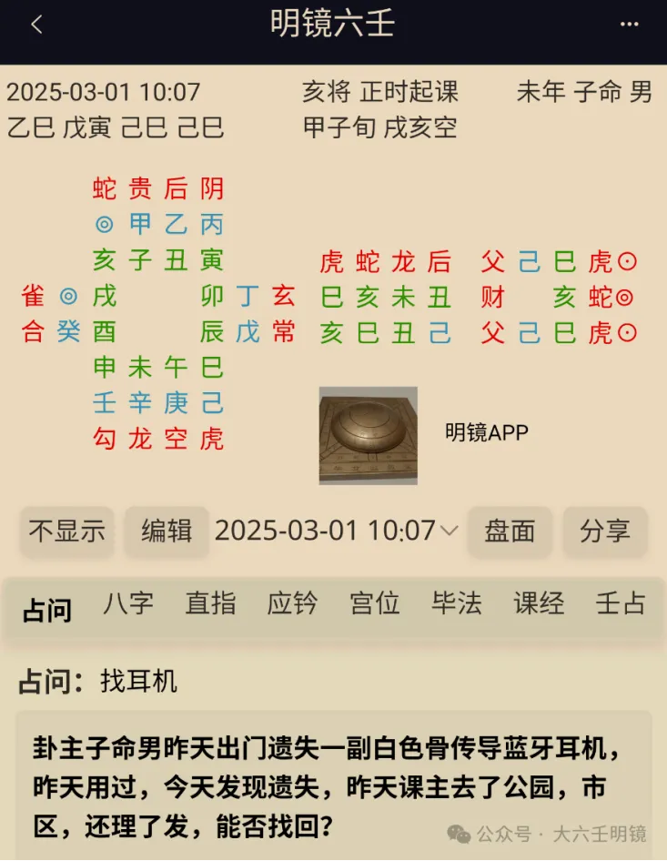 ✅ 用户实测反馈:我的耳机丢了!用明镜六壬APP占了一卦,说在理发店柜子里——居然真的找到了!这也太神了吧!!