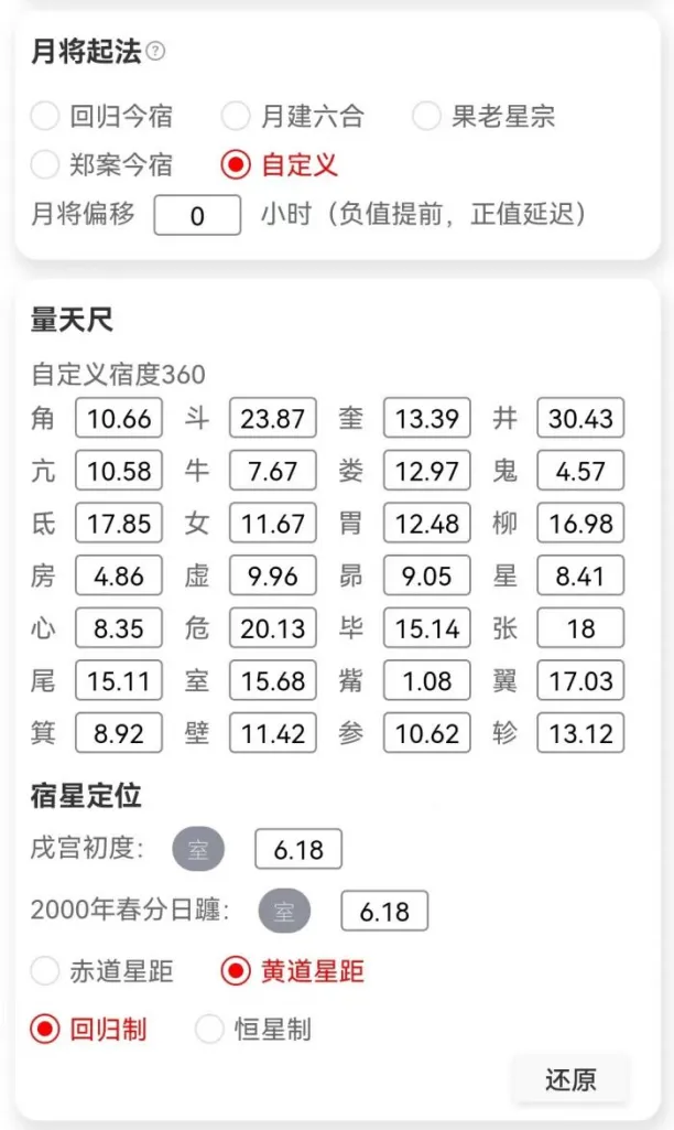 点击还原按钮时会重置默认度数,选择赤道制或黄道制时自动填入2022年赤道或黄道宿度。选择回归制或恒星制时自动填入2022赤道或黄道宿度。