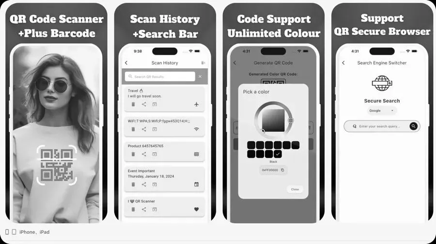 目前是英文界面,但#二维码扫描功能全到能cover所有扫码需求:高级扫描(快准稳)、扫描历史(随时查以前的码)、搜索栏(找特定码不用翻半天)、能删历史、直接打开URL、保存记录、共享数据,还能自定义生成二维码(能改颜色!)。