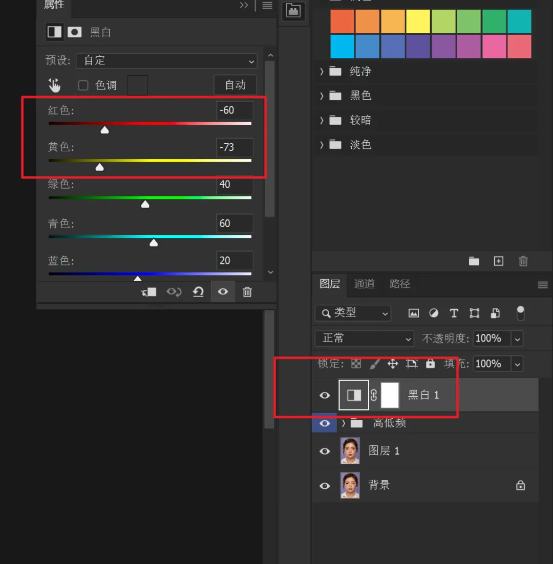 另外为了便于观察,还需创建一个灰度观察层。创建一个黑白调整层,适当的降低红色和黄色的饱和度值。