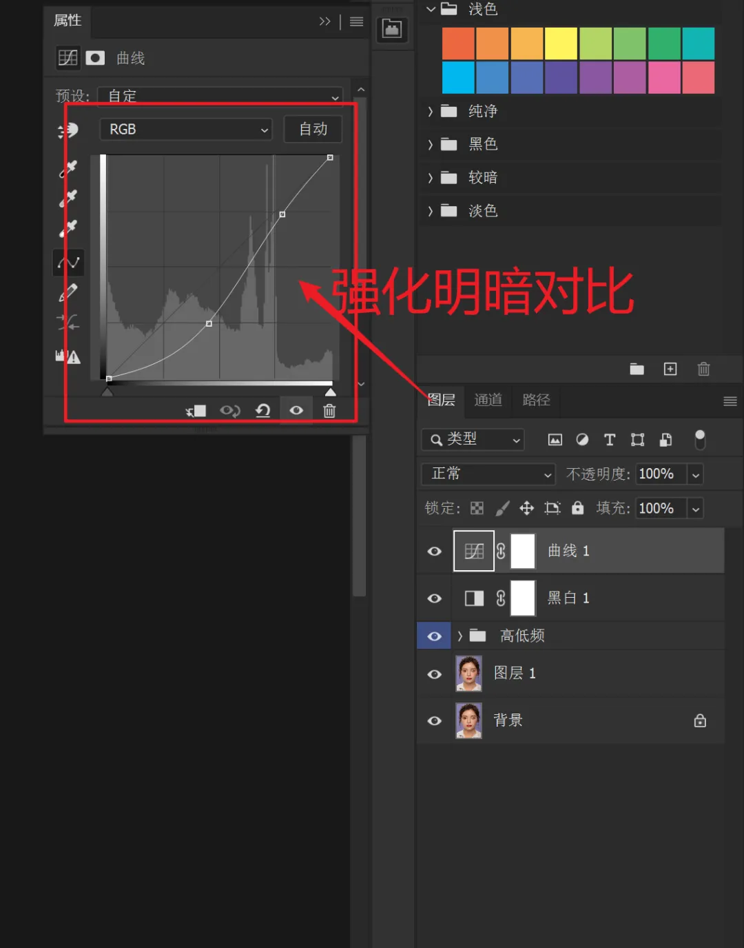 到目前为止,高低频修图的准备工作才算完成。接下来开始处理人像的光影问题。