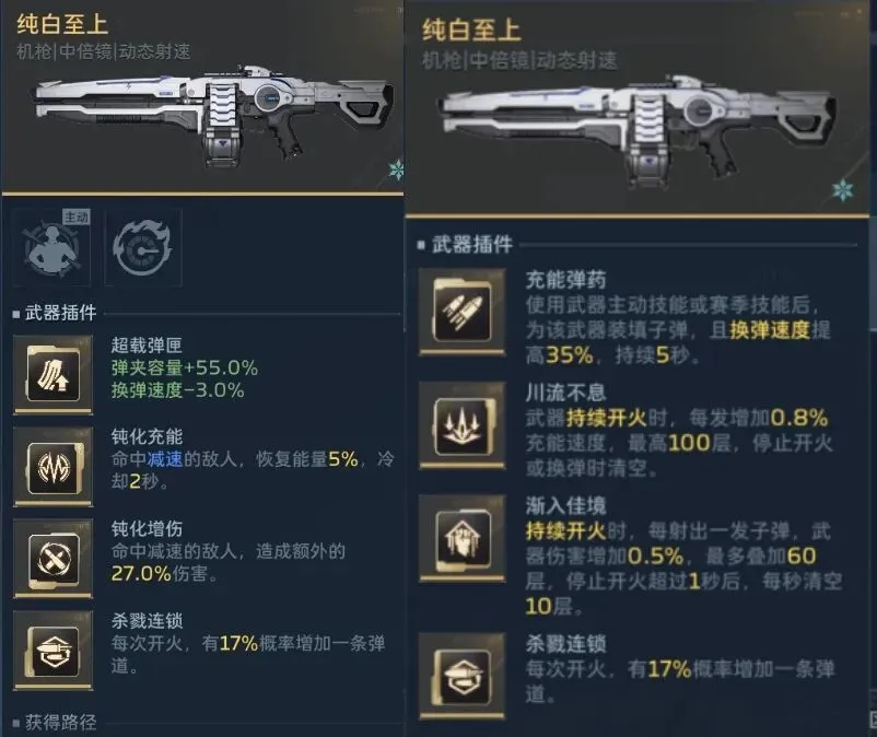 充能弹药在放武器主动技能或赛季技能时都会加主武子弹,配合乘风技能(CD短)可以让纯白补满子弹。超载就是大弹匣,不多说。