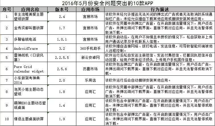 2016年5月份,广东省公安机关继续大力开展移动互联网应用安全检测工作,发现“非主流唯美爱主题壁纸锁屏”、“金秀贤都叫兽锁屏”等10款APP,存在窃取用户信息、破坏用户数据、影响移动终端运行、恶意推送广告等突出安全问题。