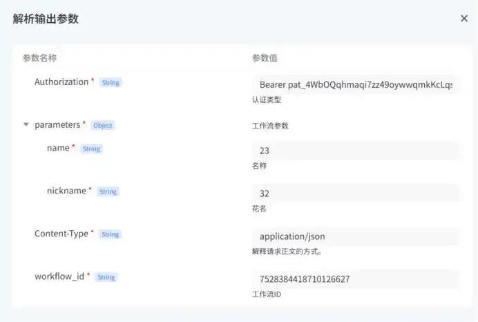 ●access_token:填写访问令牌 ●workflow_id:通过工作流页面获取