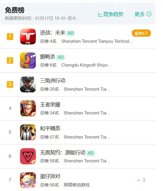 免费榜除了金山世游的《鹅鸭杀》和网易《蛋仔派对》尚有一战之力,App榜单头部几乎成了腾讯的后花园。