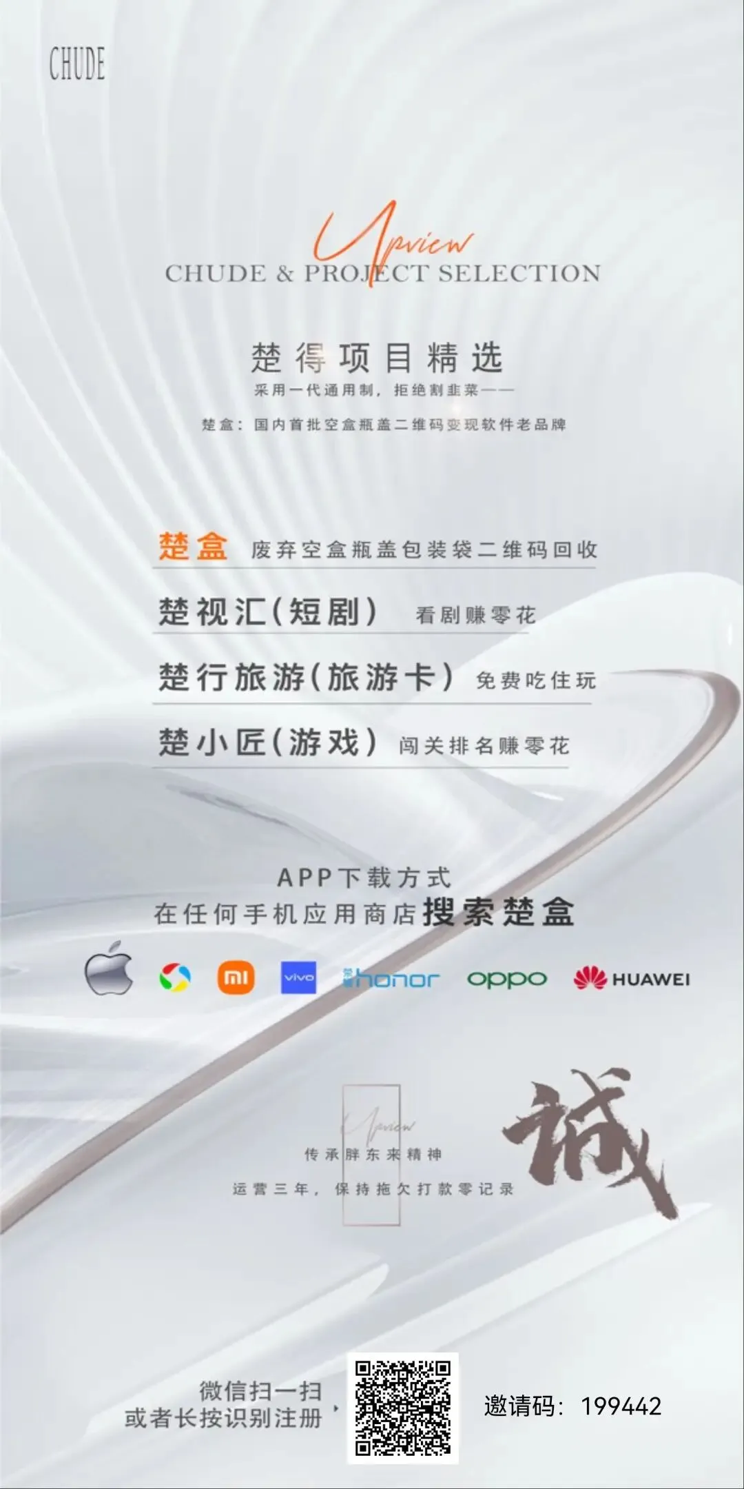 微信扫描下图二维码下载注册楚盒app!升级后的楚盒提现更便利,到账更快捷,提款直接到账微信或是支付宝!两种收款方式谁便你选!