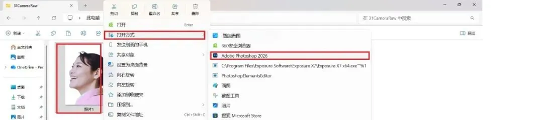 1、打开“照片1”。鼠标右键单击“照片1”,打开方式,选择AdobePhotoshop2026。如:图1。