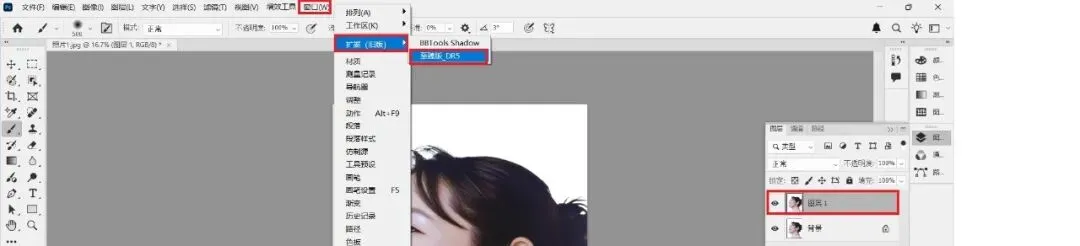 2、鼠标左键单击AdobePhotoshop2026,打开“照片1”。按Ctrl+J键,复制图层1。鼠标左键单击选择“窗口,扩展功能,至臻版DR5.0”。如:图2。