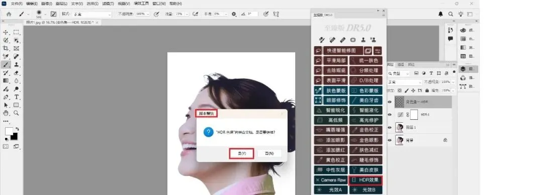 3、鼠标左键单击“至臻版DR5.0”,打开“至臻版DR5.0”编辑面板,鼠标左键单击“HDR效果”,弹出脚本警告窗口;然后,鼠标左键单击“是”。如:图3。