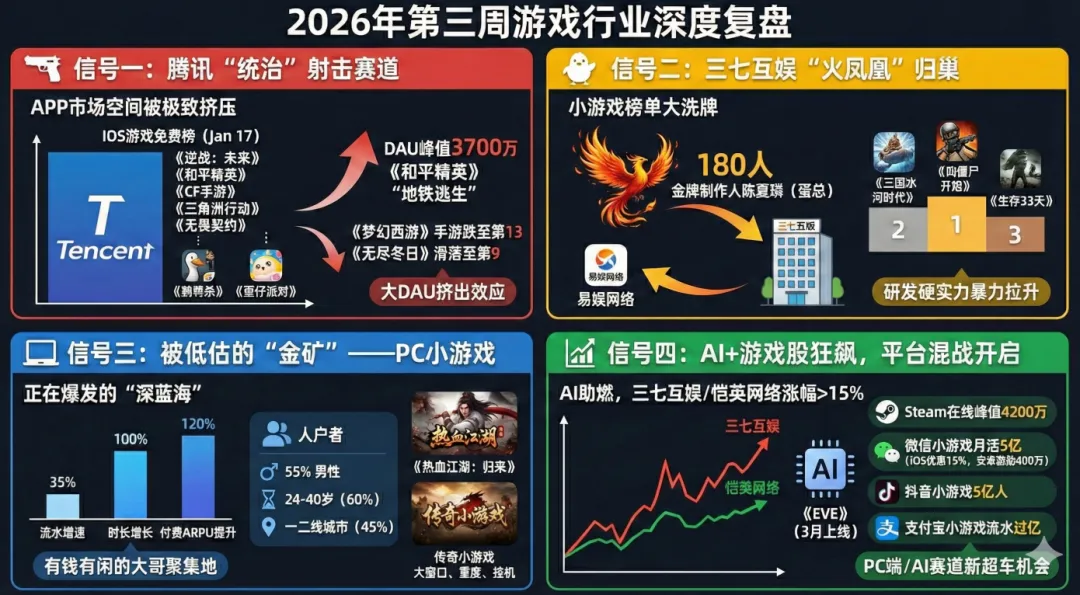 2026年的第一个月过半,游戏圈的格局正在发生剧烈的板块运动。 一边是App端腾讯的“恐怖统治力”在进一步加强,另一边是小游戏赛道(尤其是PC端)正在成为新的掘金洼地。 资本市场也闻风而动,AI概念再次引爆了游戏股。