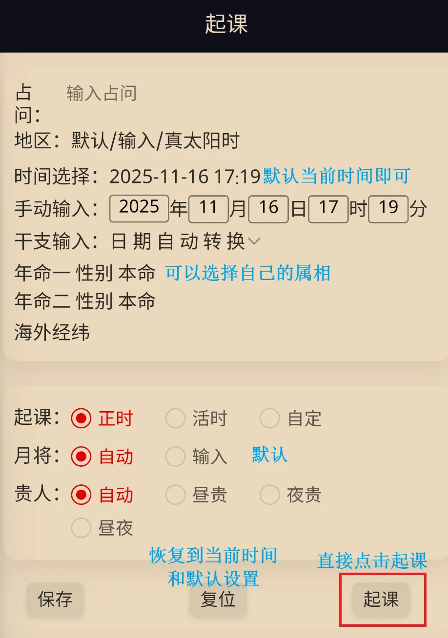 若上次选择了别的方式起课,会自动记忆起课方式,点击中间的“复位”,即可回到正时起课模式,年命也会清除。