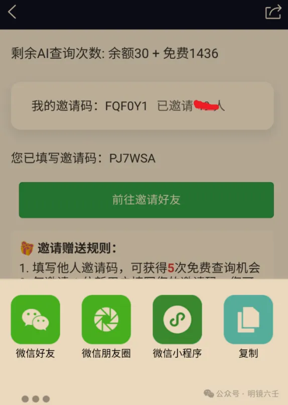 每邀请一个好友,填写你的邀请码,对方新用户获赠5次AI查询次数,邀请者获赠3次AI查询次数,邀请者赠送次数可累加。AI次数解课和知识库共用。